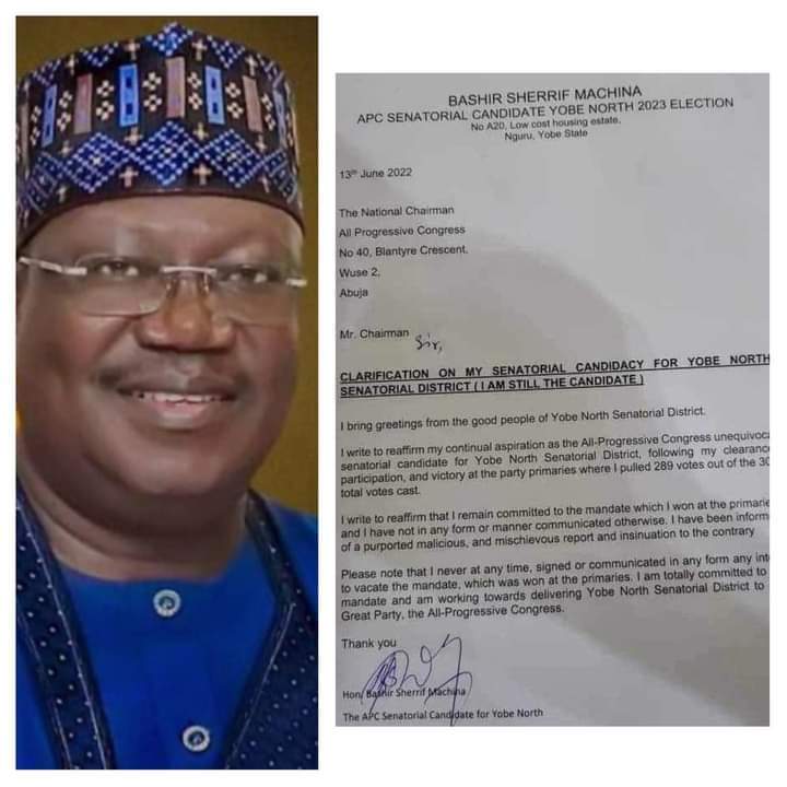 In a letter signed by Machina to the National Chairman on Monday, the senatorial candidate said, “I write to reaffirm my continual aspiration as the All Progressives Congress unequivocal senatorial candidate for one North Senatorial district, following my clearance, participation and victory at the party primaries where I pulled 289 votes out of the 300 total votes cast”.