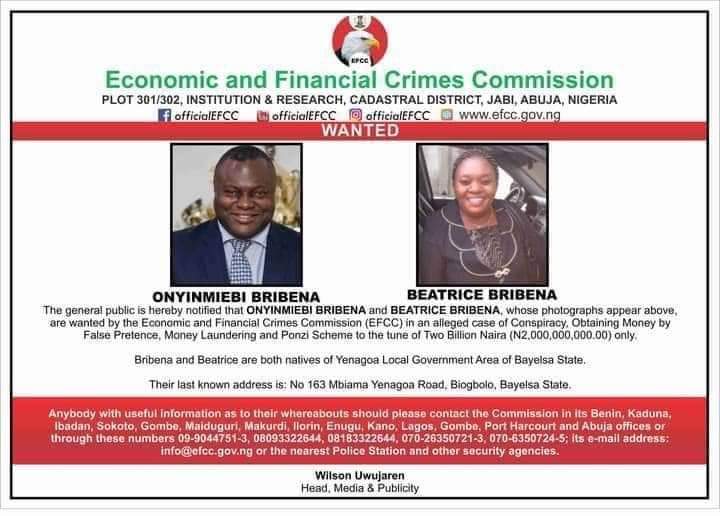 The EFCC has declared Pastor (Dr) Miebi Bribena (full name: Onyimiebi Bribena) and his wife, Beatrice Bribena wanted for allegedly defrauding Nigerians to the tune of N2 billion.