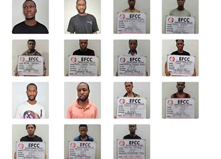 The Enugu Zonal Command of EFCC on Tuesday June 7, 2022 secured the conviction of 22 internet fraudster before Justices I.M Buba and F.O.G Ogunbanjo both of the Federal High Court sitting in Enugu on charges bordering on forgery, impersonation and obtaining money from unsuspecting foreign nationals under false pretences.
